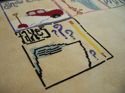 Crabby April is coming along. I changed the color of the tiniest question mark to a different blue. It was a repeat of the color next to it and I like variety. Now, I'm plugging away at the huge plot of DMC 168 that fills in the tax form. Boring...but easy to stitch and watch Supernatural reruns at the same time! I'll post a Crabby April Finish in a few days, hopefully!