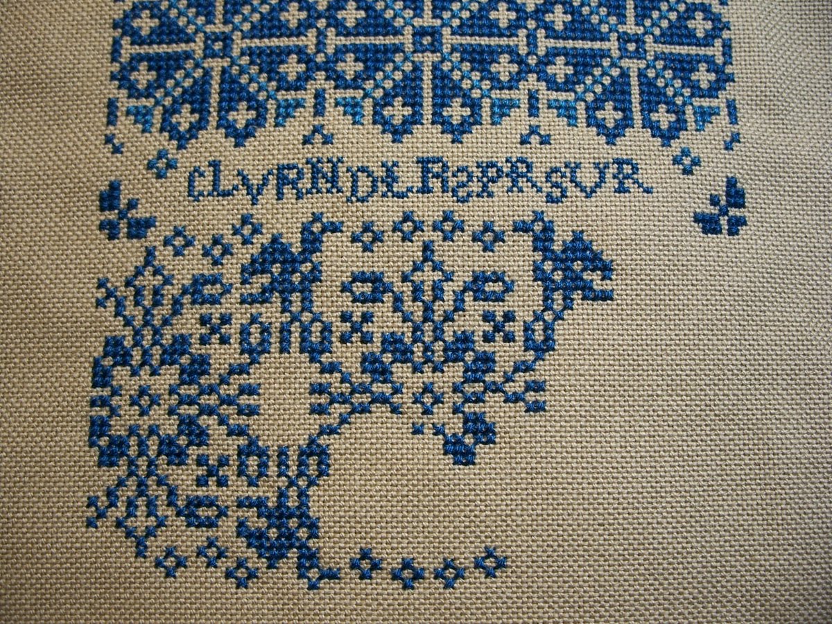 Then there are three rows left to do at the top. Isn't it pretty so far? I can't wait to do the beading! My favorite part about this design is the over-one letters ~ just so much fun to stitch!