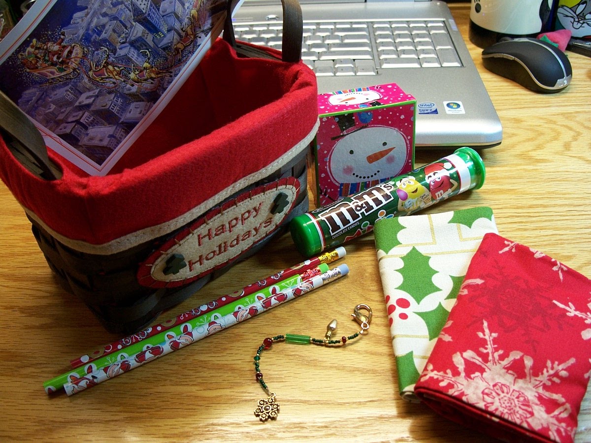 In November, Michele, of Just Another Stitching Blog celebrated her 4th blogoversary with a giveaway. Guess who won??? Yup, it was me! Since it was coming up Christmas Michele decided to make the giveaway a darling basket of Christmas goodies. There was chocolate, fun pencils, two lovely fat quarters of finishing fabrics and a beautiful seasonal scissor fob. I love the cute little box the fob came nestled in ~ snowman! Thank you for a wonderful prize, Michele!