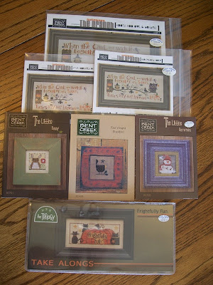 The last of my birthday stash arrived and since so many of you requested a peek I thought I'd share. I don't usually buy so much stash but it was my birthday and I felt like treating myself. I never worry about how much stash I am accumulating. I think of it as "saving for retirement." One of these days I will be on a limited income and will be glad I have so many fun projects to stitch. Hummmm, an investment in some 11 count fabric might be a good idea...as my eyesight will probably go before I actually run out of stash to stitch. ROFL