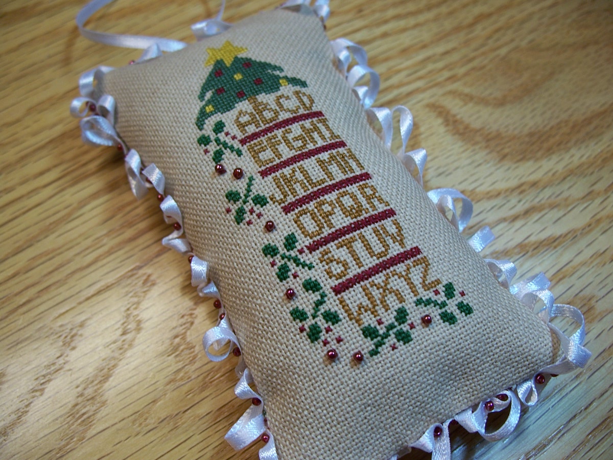 As promised in my last post, some of my finishing results. Lisa, of Hockey Mom Stitchin' Hobby, has let me know she has received my offering for our Ornament Swap. I stitched this little cutie one over one!