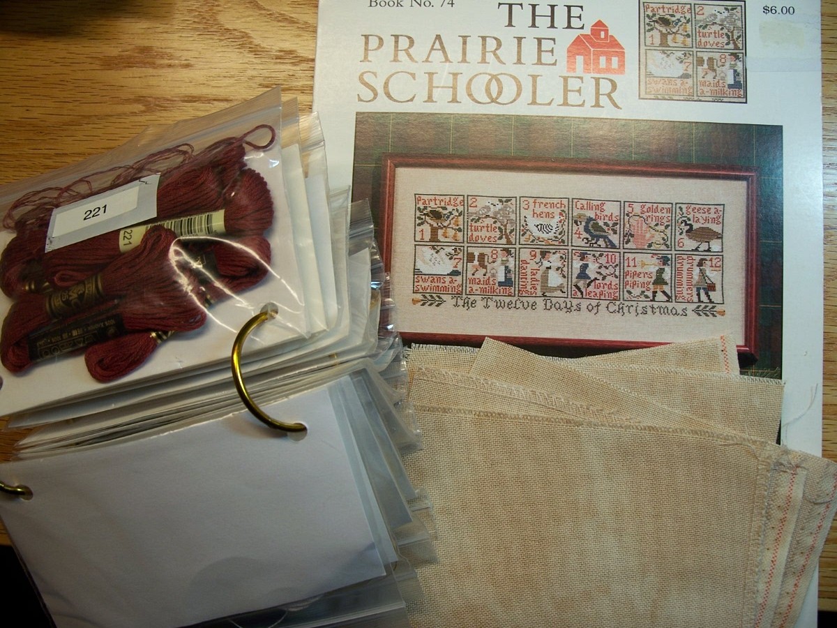 So, I snagged one Prairie Schooler chart off eBay. I've pulled my colors. Some I didn't like (copper red? For Christmas? Ewww!) and some did not match the model close enough and those were swapped out. I measured out enough 32 count Lugana, tea-stained it and cut it into 12 ornament sized pieces.