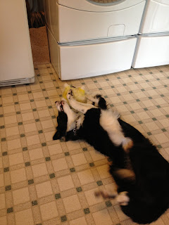 Molly is the darnedest toy-eating dog I've ever seen! She doesn't just chew them UP - she EATS them. Poor Dash awoke to find Molly vomiting up squeaky toy pieces ON HIM. Ewww! Only a couple days after the above photo was taken, the cute yellow sheepie was rescued into the trash can before it made it's way to Molly's tummy. The darn dog has eaten her way through BASKETS full of toys. We've taken to only buying those toys labeled for serious chewers!