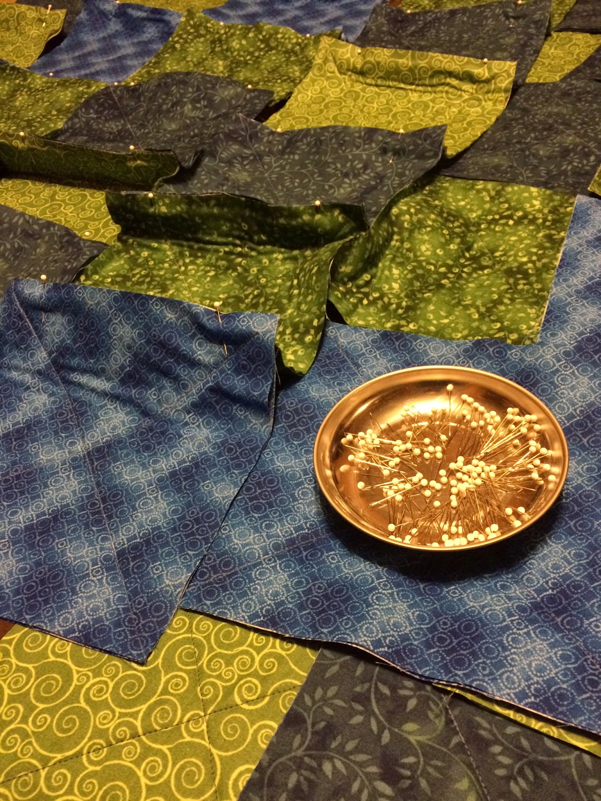 Pinning all my rows together. The silver bowl is my pincushion, a magnetic car-parts bowl stolen from Dash's garage. He says he wants it back. Over. My. Dead. Body.