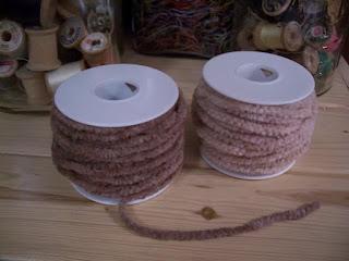 But no, once you dye it and dry it out it takes it's shape! Here are two different packages I dyed. The left is  dark brown RIT dye and the right is tan RIT dye. I just put some liquid dye into a mason jar with a cup of water, put the lid on and shook it well. (No, I didn't really measure anything. Just relax, people and let it flow!) Then I added the chenille and shook it again. After a wash with laundry detergent and letting it dry it got all round and fuzzy like I expected it to look. I must confess, when I dyed the brown, I got impatient waiting for it to dry and took the iron to it. I couldn't tell any difference between the ironed-dried one and the tan that I waited all night to air-dry. The leather cording Dash has been using for his motorcycle tassels comes on these big spools which were the perfect size to store the finished chenille on.