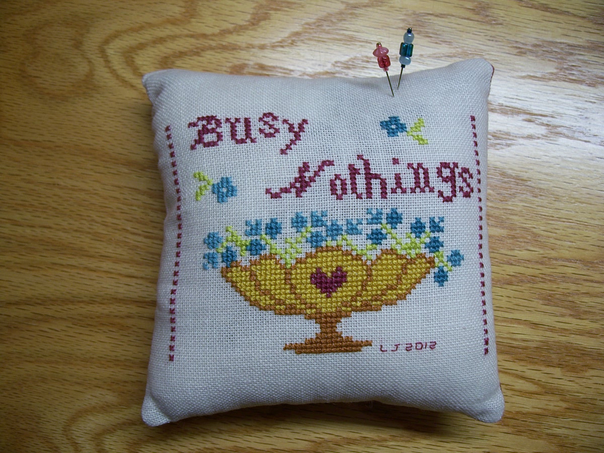 I stitched up a little Blackbird Designs pinpillow over the weekend. This was quickly finished and was a fun mini-project. I stuffed it with crushed walnut shells and trimmed it with chenille dyed brown. I need some amber or golden brown beads to make a few pins to go with it.