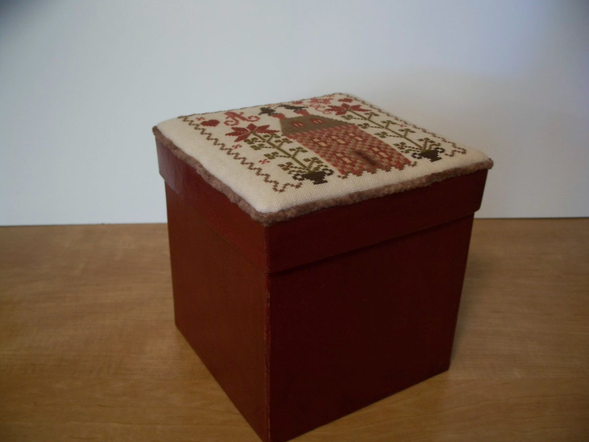 Yes, I stitched the Rosemary Pinkeep design ~ again. There is something about it I really-really like. I used the little round paper-mache box I finished the other day and attached my stitching to the lid. The chenille I dyed was used too. See my preparations in this post. I'm very pleased how it turned out, as if you couldn't tell.