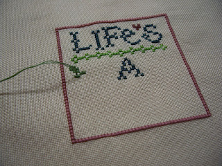 I finished Angela's Traveling Pattern a while ago. My blogging mojo has been nil so this is LATE being offered to the next stitcher!  I'm the 18th stitcher of this Lizzie*Kate design Life's A Stitch. Do you want to be #19? If so, leave a comment on this post saying you would like to and I will choose a new stitcher.