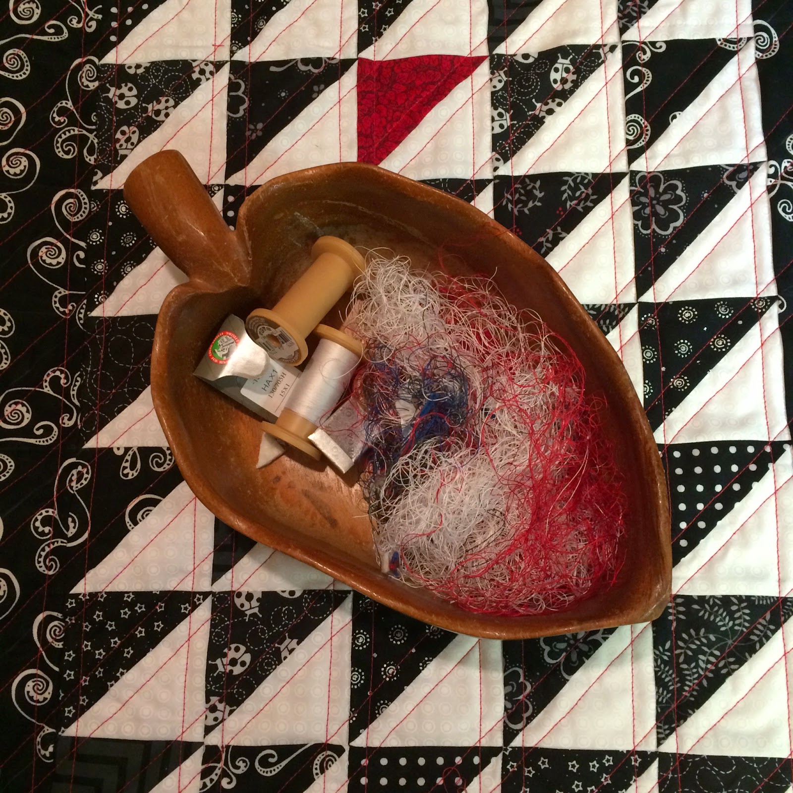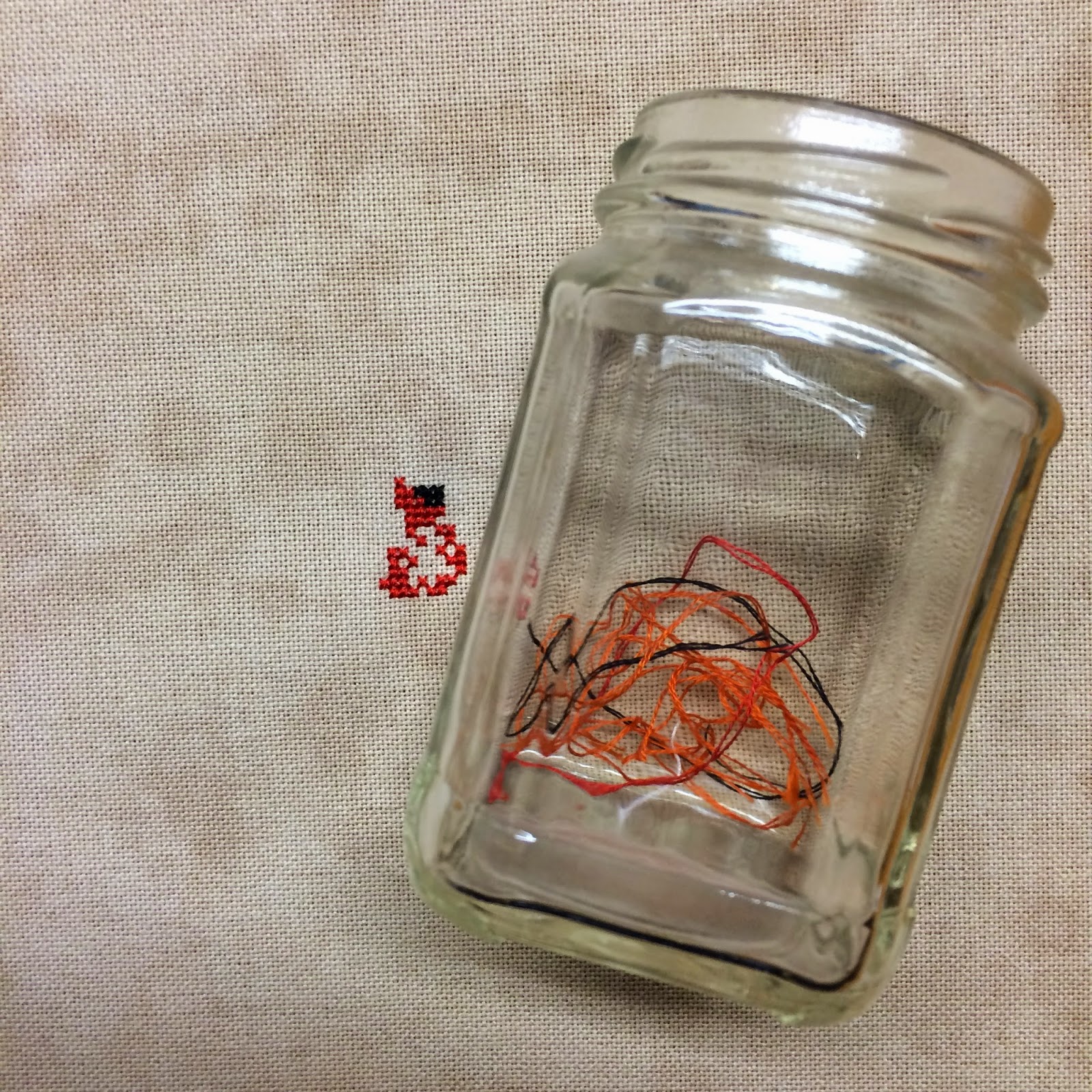 Lots and lots of quilting ORTs! The small jumble of red in there is threads from practicing my quilting skills on potholders. I am NOT showing those efforts ~ I need much more practice! I promise, there are three orange ORTs in my little jar, I actually stitched a bit but not a lot.